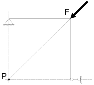 Una volta verificata l’isostaticità della struttura, si passa all’individuazione delle reazioni vincolari attraverso il metodo grafico. Nel caso in esame, è nota la direzione della forza agente F e quella della reazione del pendolo ad asse orizzontale. Dato che le due reazioni vincolari e la forza agente F devono costituire un sistema equilibrato, le loro rette d’azione dovranno passare per uno stesso punto. Tra le possibili rette d’azione dell’appoggio, l’unica che passa dal punto di intersezione (individuato dal punto P come in figura) tra la forza F e la retta d’azione del pendolo è quella verticale come indicato nella figura seguente.
