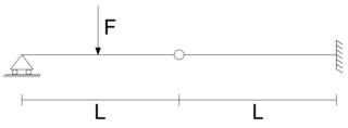 Per ricavare le reazioni vincolari si consideri inizialmente la forza F agente nel tratto a sinistra della cerniera. Questa forza viene equilibrata sia dal carrello ad asse verticale sia dalla cerniera. Dato che la forza F viene applicata nella mezzeria del tratto, entrambi i vincoli appena citati reagiscono con una forza verticale verso l’alto pari a ½ F costituendo la cosiddetta “bilancia”, rendendo così il tratto in equilibrio.