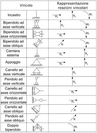 I vincoli, per impedire rotazioni o spostamenti, reagiscono alle sollecitazioni esterne per mezzo di forze che prendono il nome di REAZIONI VINCOLARI. Ovviamente un vincolo esplica un numero di reazioni vincolari medesimo al numero degli spostamenti impediti. Nella tabella seguente vengono rappresentate le diverse reazioni vincolari dei vincoli descritti nella Lezione 1. È importante sottolineare che il verso delle reazioni vincolari descritte nelle due tabelle è indicativo, dato che dipende dal bilanciamento della struttura in esame.
